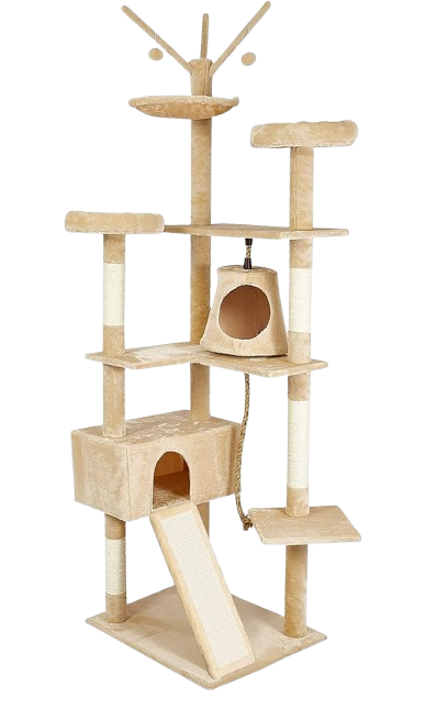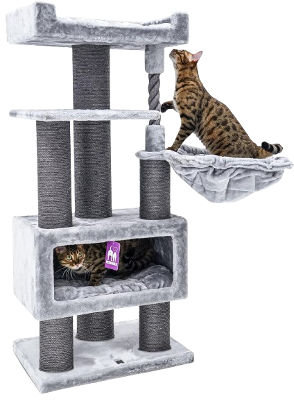 - Offrez à votre chat un véritable paradis vertical ! Avec ses 2 niches confortables, 2 plateformes d’observation, 4 griffoirs en sisal et 3 pompons suspendus, cet arbre à chat géant combine divertissement, repos et griffades en toute sécurité.